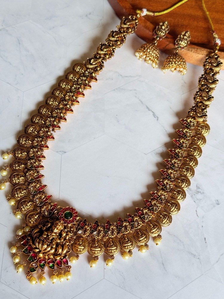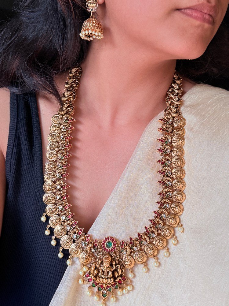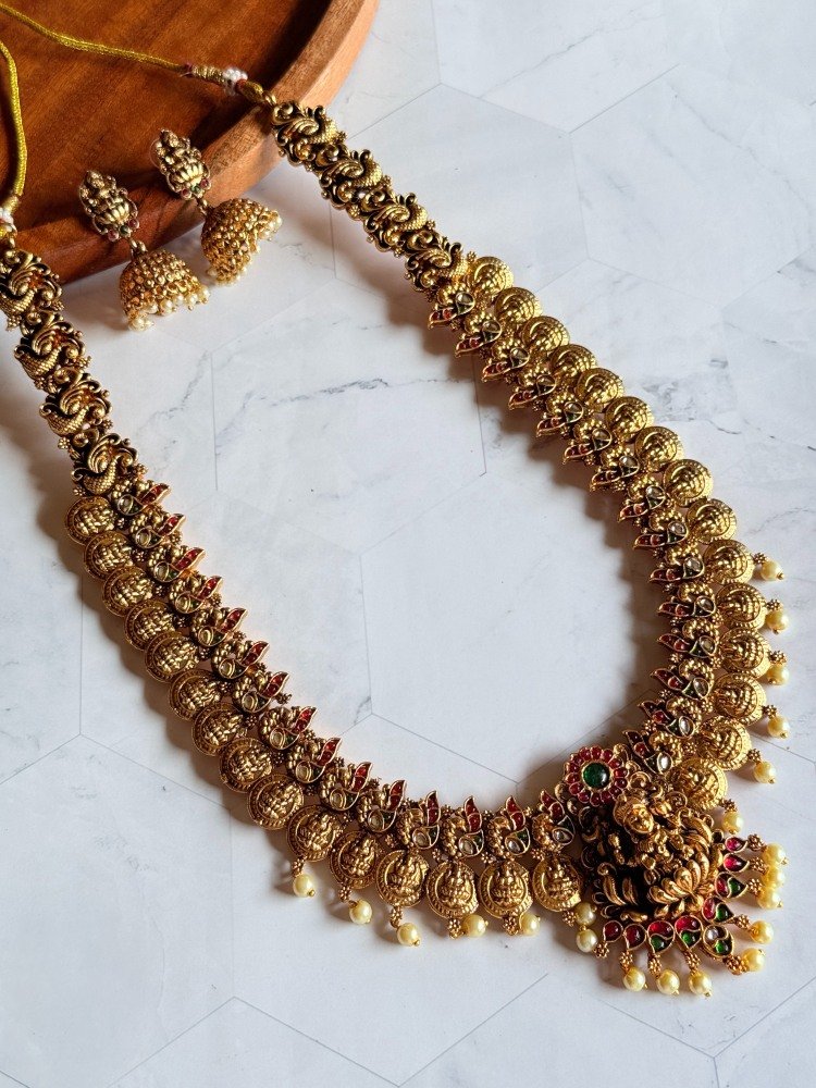 Get the Antique Stone Studded Haram Necklace Set at Subhranika Jewellery Collection. This stunning, stylish necklace piece offers timeless style for women. Buy exclusive temple jewellery for women and add a touch of luxury to your everyday look. Shop now!