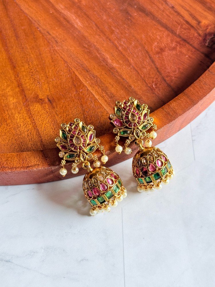 Get the Lotus Design South Indian Style Jhumkas at Subhranika Jewellery Collection. This stunning, stylish necklace piece offers timeless style for women. Buy exclusive temple jewellery for women and add a touch of luxury to your everyday look. Shop now!