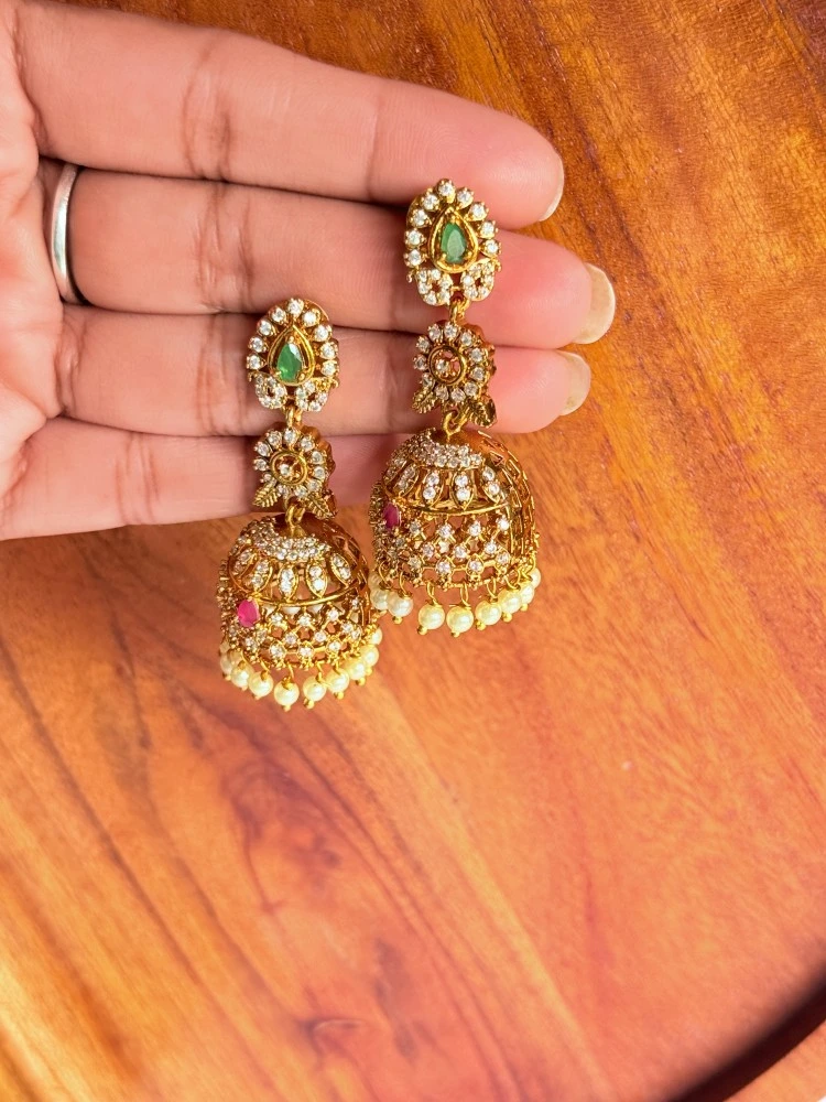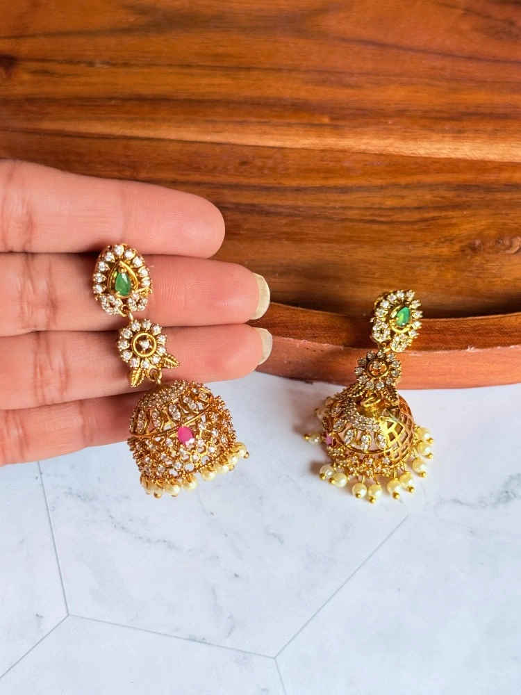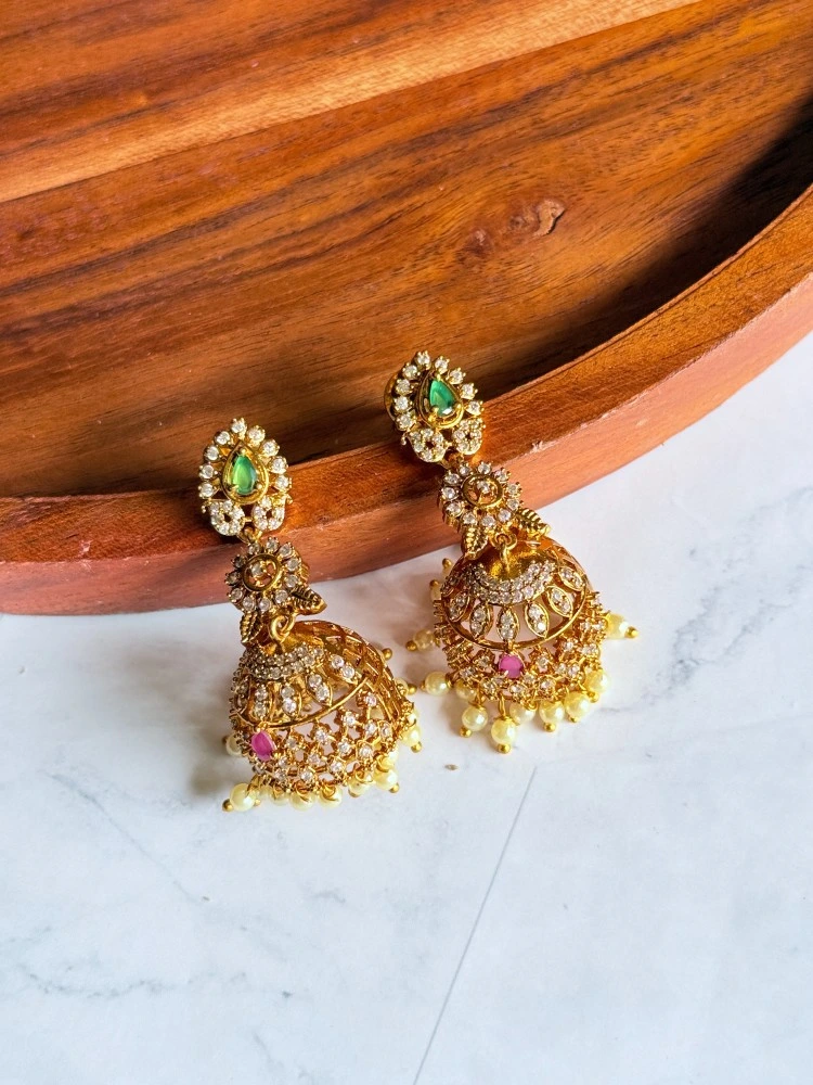 Buy the Mid Length Premium AD Temple Jhumkas from Subhranika Jewellery Collection. These stunning, stylish jhumka pieces offer timeless style for women. Buy exclusive temple jewellery for women and elevate your everyday look with a touch of luxury. Shop now!
