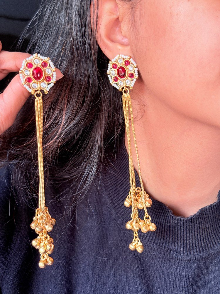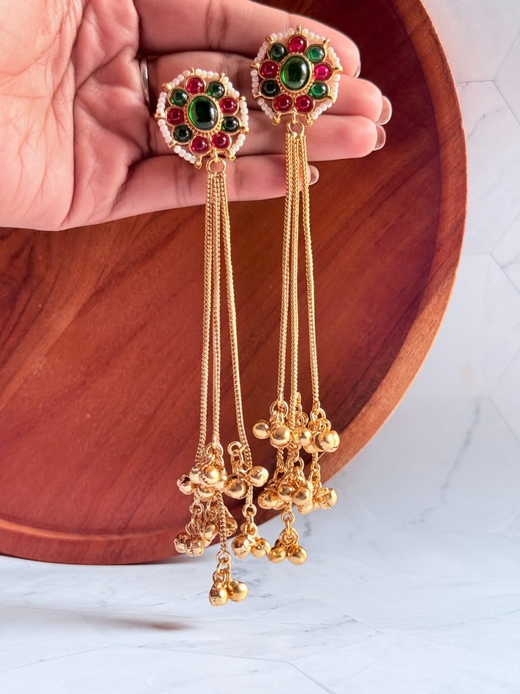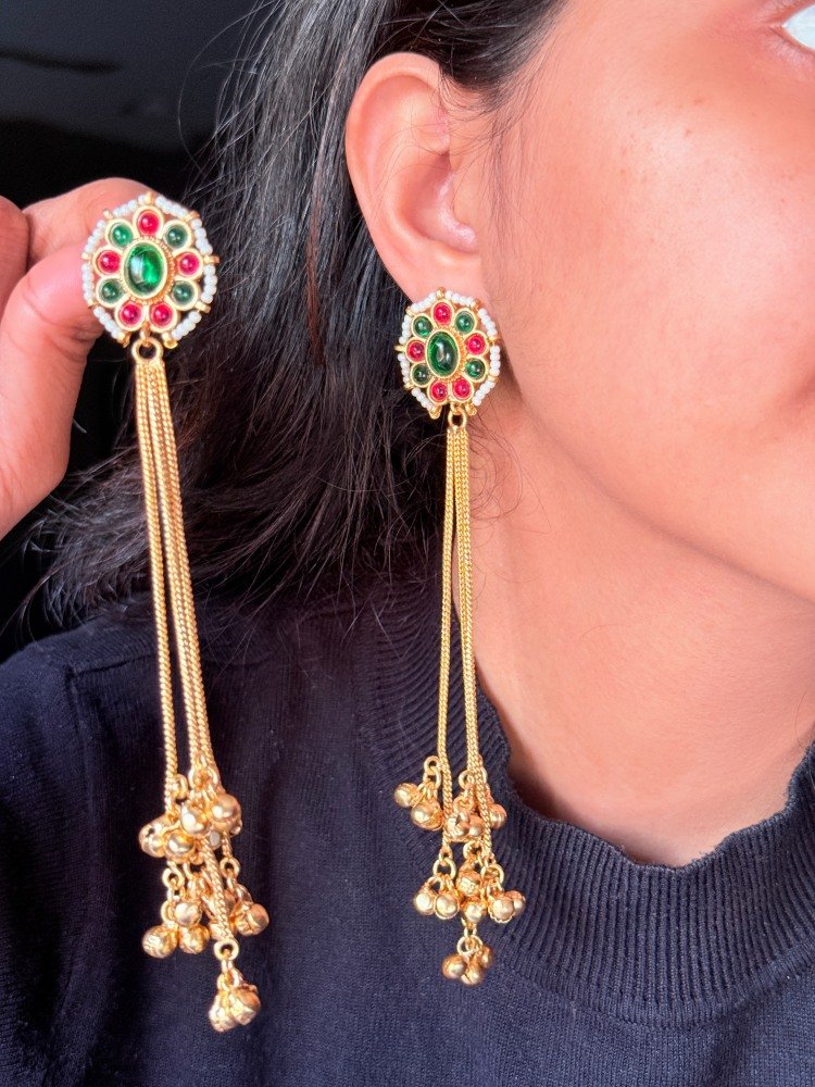 Get the Stone Studded Sleek Ghungroo Golden Earrings at Subhranika Jewellery Collection. These stunning, stylish jhumka pieces offer timeless style for women. Buy exclusive temple jewellery for women and add a touch of luxury to your everyday look. Shop now!