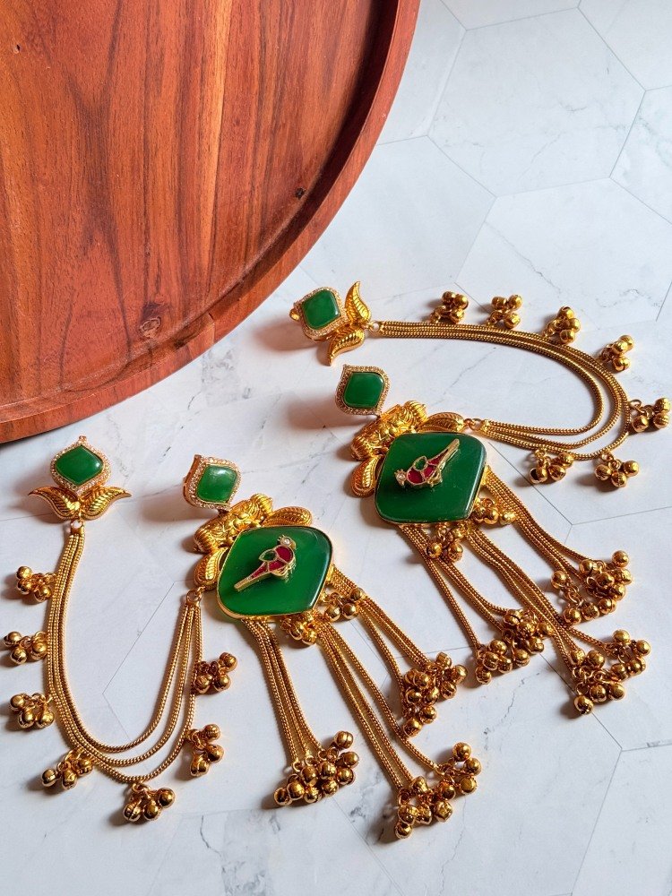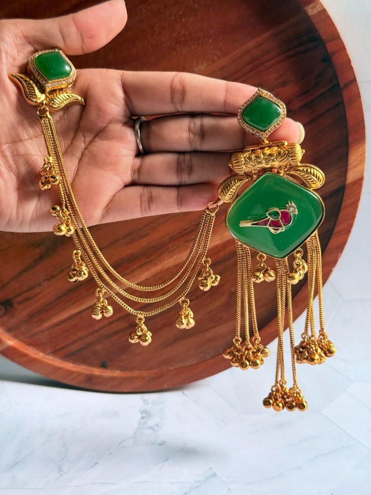 Get the Unique Green Pachi Kundan Kaan Chain Earrings at Subhranika Jewellery Collection. This stunning, stylish necklace piece offers timeless style for women. Buy exclusive temple jewellery for women and add a touch of luxury to your everyday look. Shop now!