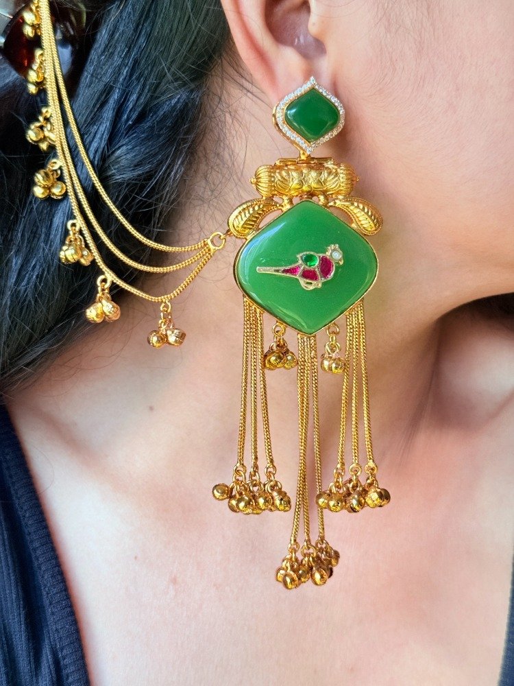 Unique Green Pachi Kundan Kaan Chain Earrings
